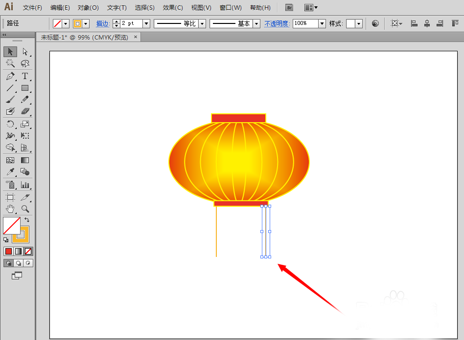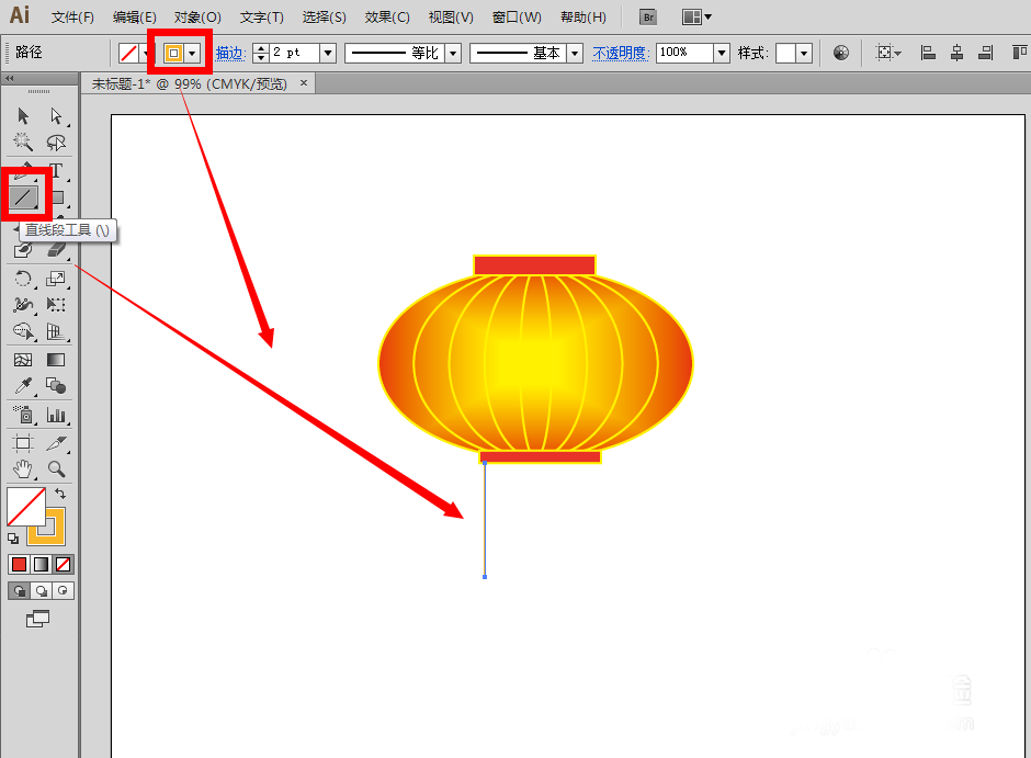 3、接着,把填充颜色设置为无,描边颜色设置为橙色,使用直线段工具,按住shift键,在灯笼底下的矩形的底下绘制一条直线