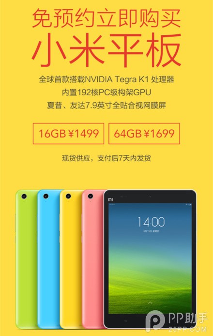小米平板首批开售的日期为7月1日,到今天刚好满一个月,而小米则宣布售价1499元起的小米平板从今天开始正式免预约现货供应,支付完成后7天内发货。
