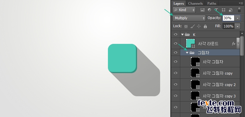 选择阴影的文件夹,设置混合模式为正片叠底,不透明度30%,这里的阴影形状就完成。