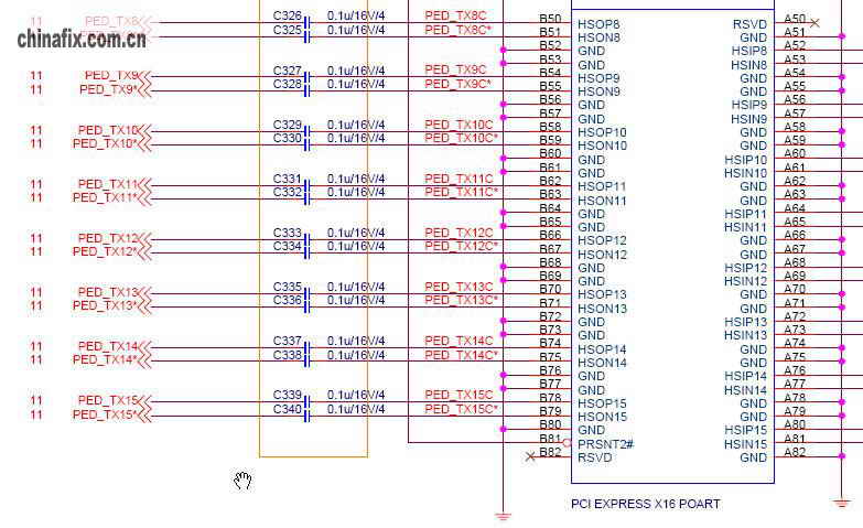此主板故障为PCI-E16X无显示,查电压,频率等均正常,量PCI-E至北桥之间的耦合电容,发现C336北桥一端无值,指压北桥后有正常的数值读出。判断为北桥空焊,重新加热后OK。。