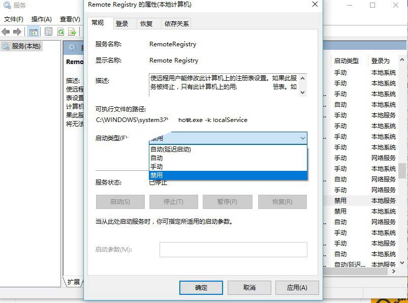 双击打开Remote Registry设置后,启动类型改成“禁用”,并点击底部的“确定”保存就可以了。
