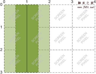 如下图,假如我想绘制一条从(1,0)到(1,3)的线,由于线的默认宽度是一个像素,所以在我想象中应该绘制成深绿色的部分,即在坐标 1 两边各占半个像素的宽度。