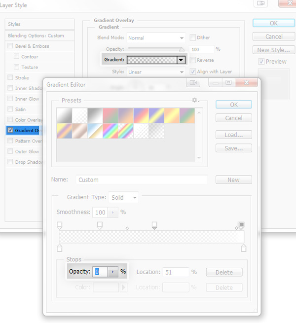 现在再次使用混合画笔工具。使用矩形工具绘制一个矩形,双击添加渐变叠加,且如图设置不透明度。你也可以手动设置——目的是绘制一个顶部白色,中间半透明,底部透明的模糊效果。