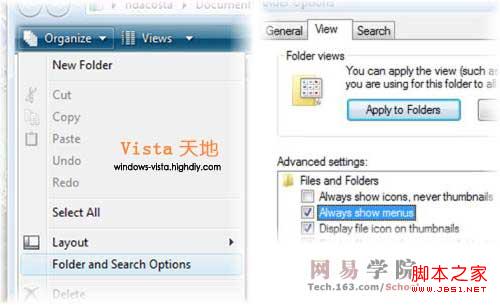 通过以上的步骤,这样,即可让资源管理器的菜单项一直显示。而如果随着对Windows Vista使用时间的延长,适应了Windows Vista的操作习惯后,也可按同样的步骤将资源管理器菜单项关闭,只需重复以上的步骤,取消对“一直显示菜单(Always show menus)”的选择。