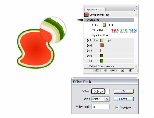 在这一步,需要给那些笔刷纹理添加蒙版,清理干净每个字母的边缘。选择字母S,对象>路径>偏移路径,使用-6px的偏移量。现在你得到了一个小一些的红色果肉区域。将这个形状至于最前(Ctrl+Shift+]),然后在外观面板中点击清楚外观按钮,清除掉所有填色和描边。待会儿需要使用这个形状来添加蒙版。