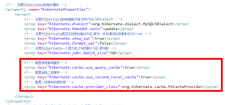 <!-- 配置使用查询缓存 --> <prop key="hibernate.cache.use_query_cache">true</prop> <!-- 配置启用二级缓存 --> <prop key="hibernate.cache.use_second_level_cache">true</prop> <!-- 配置二级缓存的提供商 --> <prop key="hibernate.cache.provider_class">org.hibernate.cache.EhCacheProvider</prop>