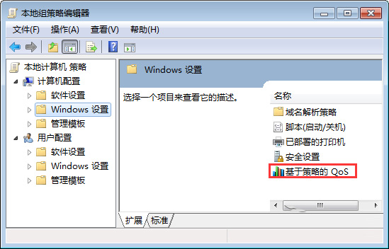 第三步、打开本地组策略编辑器界面后在左侧菜单中点击“windows设置”选项,然后在右边界面中找到“基于策略的Qos”选项,右击“基于策略的Qos”,选择“高级Qos设置”如图设置即可。