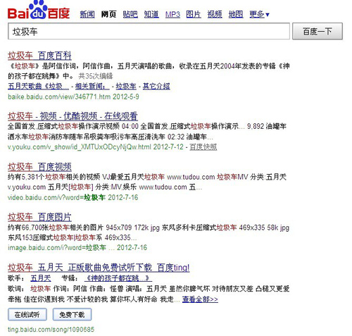 上图是笔者搜索相关关键词后的搜索结果页面,细心的你可能会发现排在前面五个的网站中根本没有相关行业的企业站点,取而代之的是五月天新出的专辑中的一首歌。那么为何搜索结果中没有相关的企业站点而是一首流行歌曲的信息了。其实如果你仔细研究一下“垃圾车”这个关键词之后你就会发现这个词在五月天推出这首歌之前搜索量并不高,也就是说现在很多搜索这个词的人的需求还是五月天的歌曲,而不是相关的企业。