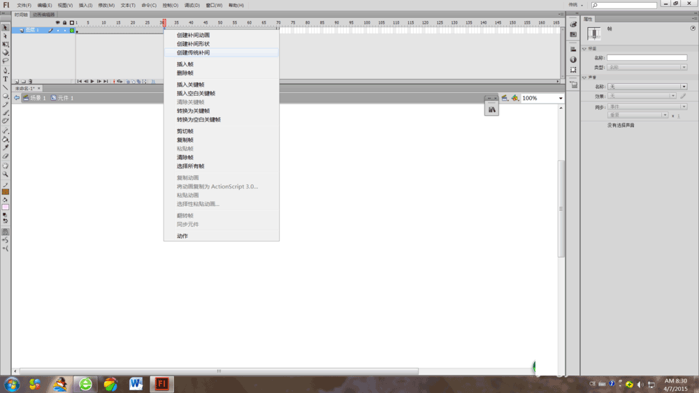 4、在元件里创建一段传统补间,在最后的关键帧上调整花瓣的位置,大小,并将花瓣进行旋转,倾斜