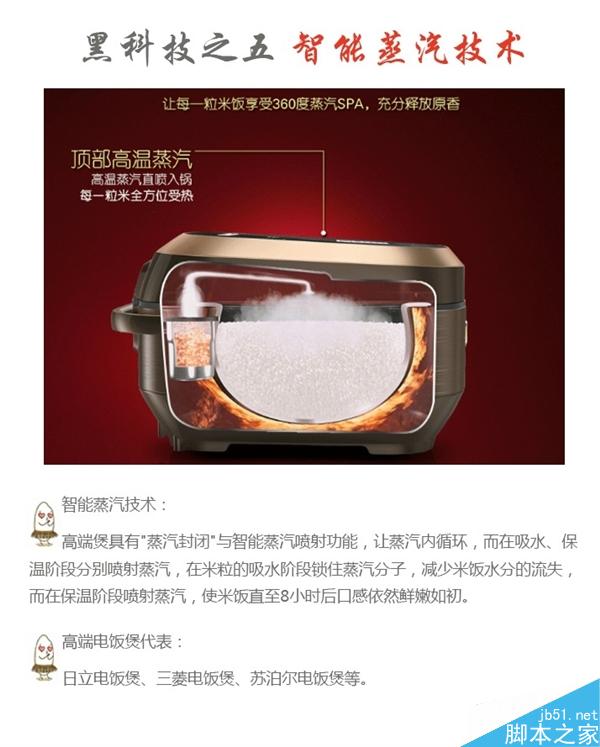 五大黑科技有:内锅材质、层数,真空加压技术,IH多段加热技术,内锅形状,智能蒸汽技术。