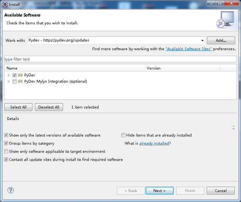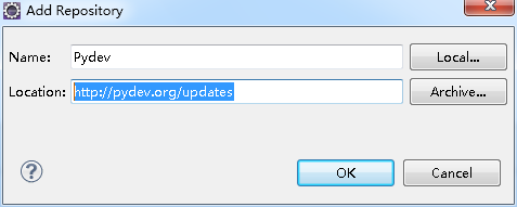 启动Eclipse, 点击Help->Install New Software... 在弹出的对话框中,点Add 按钮。 Name中填:Pydev, Location中填http://pydev.org/updates