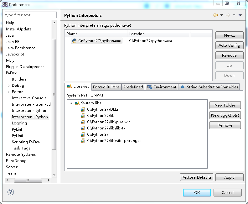 在对话框中,点击pyDev->Interpreter - Python. 点击New按钮, 选择python.exe的路径, 打开后显示出一个包含很多复选框的窗口. 点OK