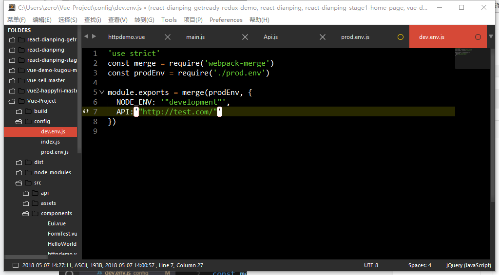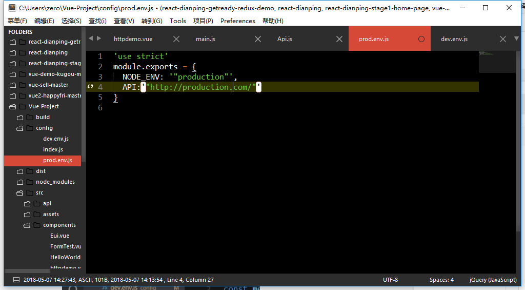本项目是vue-cli搭建的项目框架,引入axios用于数据请求。配置不同的接口地址,(首先确保已经集成了axios,如对集成axios有疑问的道友,可参看我之间的一篇vue-cli 引入axios)操作如下