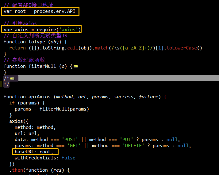 二、在自己重新封装的axios文件中(api/api.js),将配置好的接口地址作为baseURL拼接到接口路径中