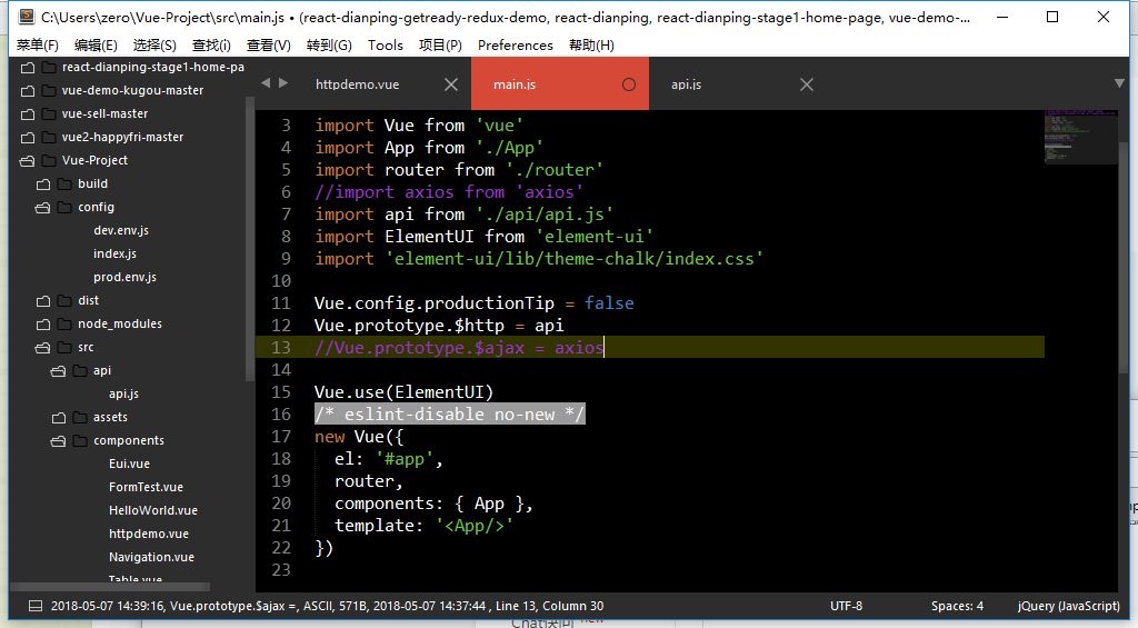 三、修改main.js,引入自己重新封装好的axios文件(api/api.js),修改好的文件如下图所示