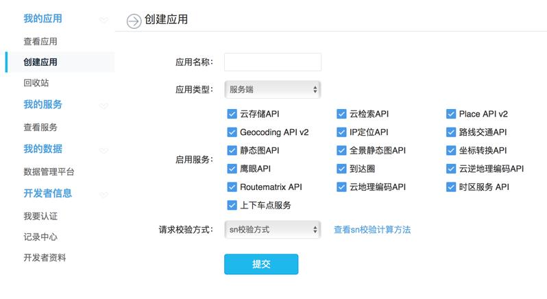 激活后可看到后台页面,现在可以开始创建应用了,这里请求校验方式有两种,一种是白名单IP,另一种是SN校验(旁边有计算的说明),我选择SN校验: