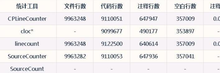 通常,文件总行数和空行数统计规则简单,不易出错。因此,选取这两项统计重合度最高的工具作为基准,即CPLineCounter和linecount。同时,对于代码行数和注释行数,CPLineCounter和SourceCounter的统计结果重合。根据统计重合度,有理由认为CPLineCounter的统计精度最高。