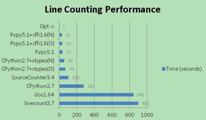 图中"Opt-c"表示CPLineCounter以-c选项运行,"CPython2.7+ctypes(O)"表示以CPython2.7环境运行附带旧DLL库的CPLineCounter,"Pypy5.1+cffi1.6(N)"表示以Pypy5.1环境运行附带新DLL库的CPLineCounter,以此类推。