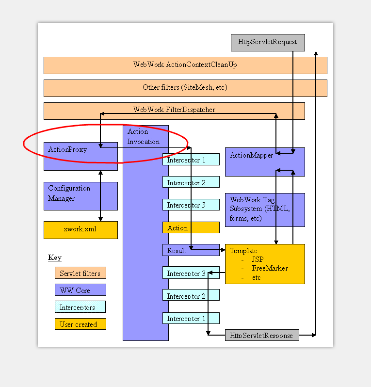 一路走来,终于要开始 webwork 核心业务类的总结,webwork 通过对客户端传递的 web 参数重新包装,进行执行业务 Action 类,并反馈执行结果,本篇源码分析对应下图 WebWork 框架流转图中红色框的地方。