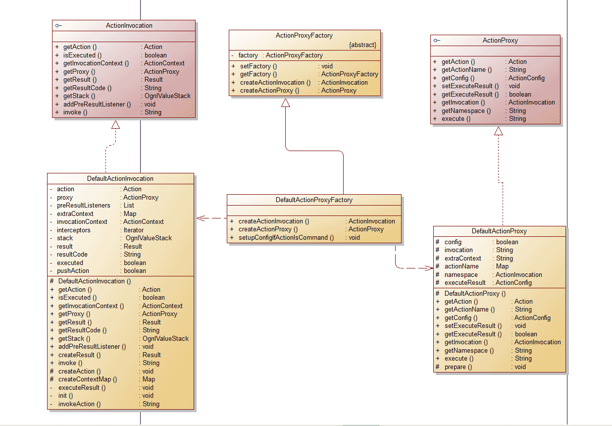 •ActionProxy是一个接口,ActionProxyFactory则是一个抽象类,默认情况下它们是通过 DefaultActionProxy和DefaultActionProxyFactory来完成操作的。