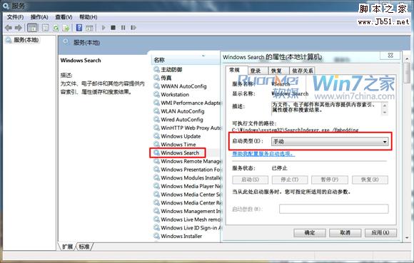 1、在“控制面板”-“管理工具”中打开“服务”,找到“Windows Search”,双击该项打开“属性”窗口,可以临时“暂停”或者“停止”该服务,也可以彻底停止,只要将其“启动类型”设置为“手动”或者“禁用”,如果需要重新启用此功能,只需在此设置“启动类型”为“自动”,重启电脑后自动启用该服务。