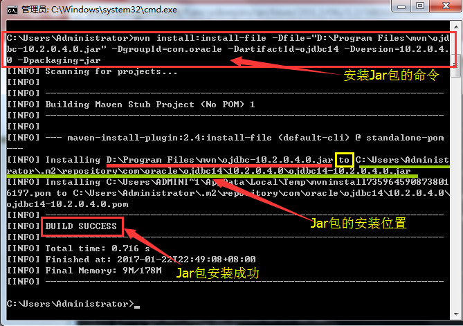 重点:Jar包默认都安装在“C:\Users\Administrator\.m2\repository\”下,其实上面的(参数二,参数三,参数四)就是指定安装具体的安装路径。