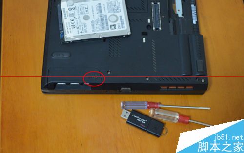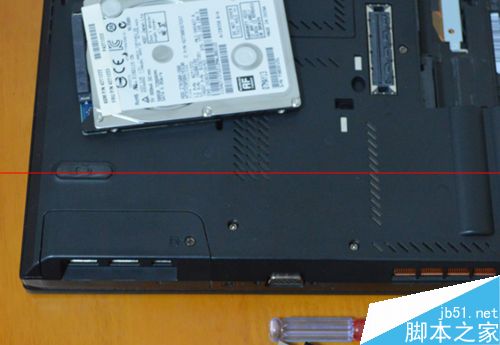 3、T430的原硬盘在这个位置,如图,我们只需用螺丝刀拆下这颗螺丝,拿下外盒即可(螺丝是和部件紧密连接的,所以螺丝松掉后可以慢慢活动机壳拿下),把途中唯一画圈的螺丝拧松(硬盘盖上的),注意:螺丝取不下来。