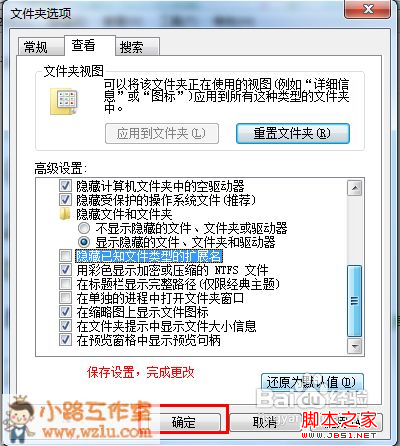 3、在查看菜单栏下的高级设置里拖动下拉栏,找到“隐藏一直文件的扩展名”这一项, 取消勾选。