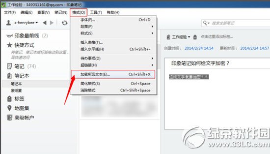 2、选中文字内容后,点击菜单栏中的“格式”菜单,选择“加密所选文字”或使用快捷键:Ctrl+shift+X。