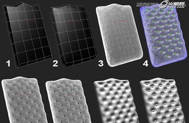 在这里我只解释沙发椅的靠背部分。基础模型是方盒子。先把大致外形确定好。然后进行一次圆滑处理。接着使用棋盘变形器。确定好边缘线。强度为25、重复次数为3。