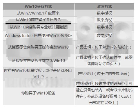 从以上图表内容可知,从Windows7/Windows 8.1(一年内)升级到Win10的设备,从Win10商店购买的家庭版、专业版,以及从家庭版升级到专业版,Win10预览版等都不需要产品密钥,而是采用绑定设备(数字授权)的方式自动激活。