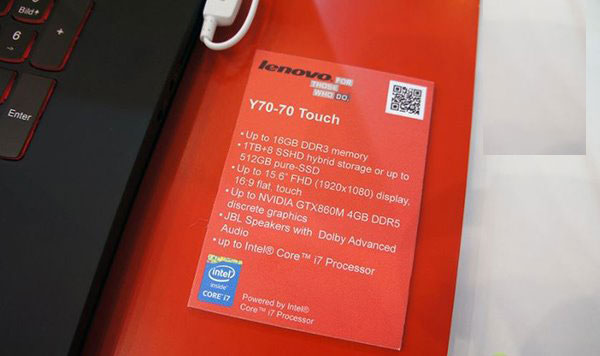 3、硬件配置参数方面:Y70-Touch有多款机型配置可选。最高配版本将搭载英特尔酷睿i7 4710Q 处理器、16GB DDR3内存、4GB DDR5显存的Nvidia GTX 860M显卡、1TB硬盘+512GB固态硬盘、带底部独立低音炮的JBL音箱、双散热风扇。
