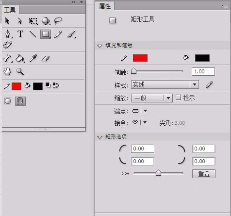 3、如果,我们单击工具箱内的 矩形工具之后,我们发现 属性面板变了:如下图所示。这里有一个 矩形选项,是用于绘制圆角矩形的,我们拖动最下方的滑块,就可以同时修改四个圆角的数值,然后在舞台上就可以绘制圆角矩形了。大家可以自行尝试一下。同理,更换为椭圆工具后,我们发现,与矩形工具的属性面板如出一辙。