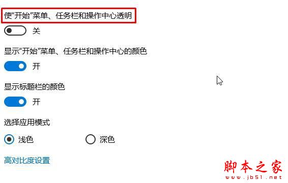 3、在右侧找到【使“开始”菜单、任务栏和操作中心透明】下面的开关关闭;