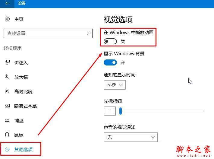 5、在左侧点击“其他选项”,在右侧将【在Windows 中播放动画】的开关关闭即可。
