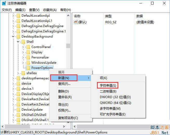 2、定位到以下目录:\HKEY_CLASSES_ROOT\DesktopBackground\Shell\,在此目录下新建项,并将新项命名为:PowerOptions;