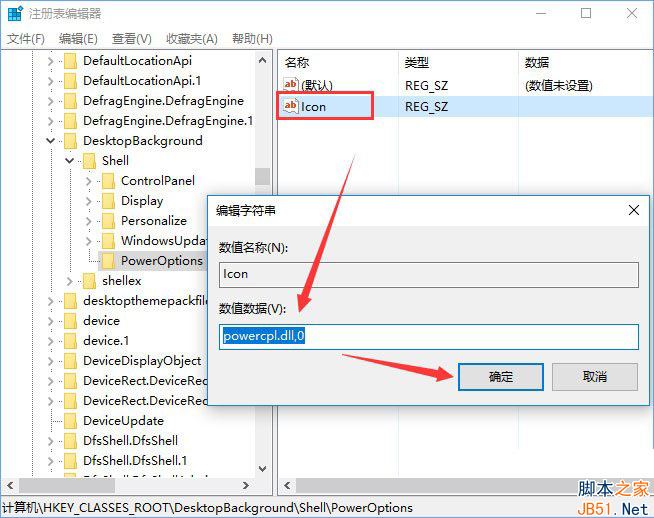 3、点击进入我们刚刚创建的名为PowerOptions的项,在此项下新建字符串值,并将新字符串值命名为:Icon,双击我们刚刚新建的名为Icon的字符串值,将其数值数据设置为:powercpl.dll,0;