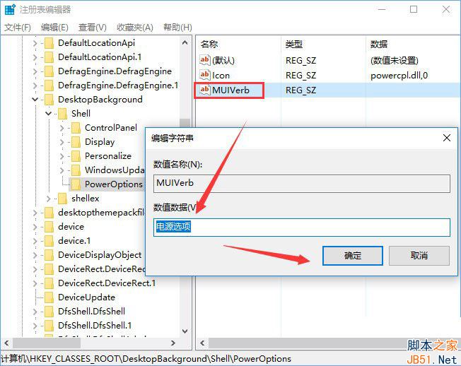 4、在PowerOptions项下新建字符串值,并将新字符串值命名为:MUIVerb,双击我们刚刚新建的名为MUIVerb的字符串值,将其数值数据设置为:电源选项;