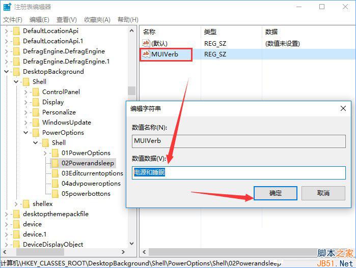 10、到以下目录:\HKEY_CLASSES_ROOT\DesktopBackground\Shell\PowerOptions\Shell\02Powerandsleep\,在02Powerandsleep项下新建字符串值,并将新字符串值命名为:MUIVerb,双击我们刚刚新建的名为MUIVerb的字符串值,将其数值数据设置为:电源和睡眠;