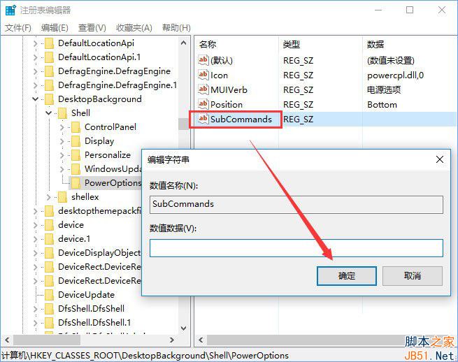 6、在PowerOptions项下新建字符串值,并将新字符串值命名为:SubCommands,无需设置数值数据;