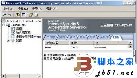 第1步,打开ISA Server服务器管理窗口,在“监视”节点下切换到“日志”选项卡,并单击“编辑筛选器”超链接,如图所示。
