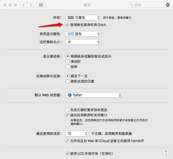 第三步、在通用窗口,点击勾选“外观”选项下面的“使用暗色菜单和Dock”即可!一定要注意“外观”里面有两种选择方式,建议选择成石墨色
