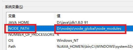 注意,此时,默认的模块D:\nodejs\node_modules 目录将会改变为D:\nodejs\node_global\node_modules 目录,如果直接运行npm install等命令会报错的。我们需要做1件事情: 1、增加环境变量NODE_PATH 内容是:D:\nodejs\node_global\node_modules