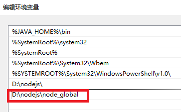 对path环境变量添加D:\nodejs\node_global win10以下版本的,横向显示PATH的,注意添加到最后时,不要有分号【;】