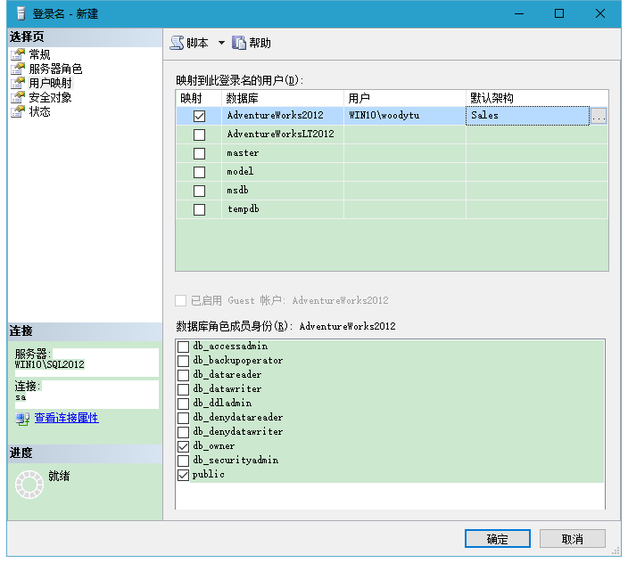 插图2.5:授予Windows登录访问AdventureWorks2012数据库
