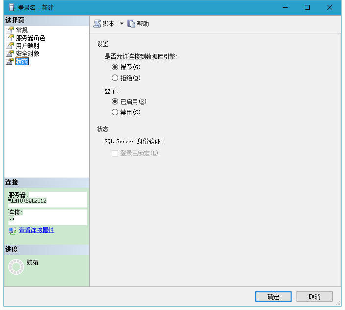 插图2.6:授予和拒绝连接到数据库和临时禁用登录账号选项点击【确定】创建用户。