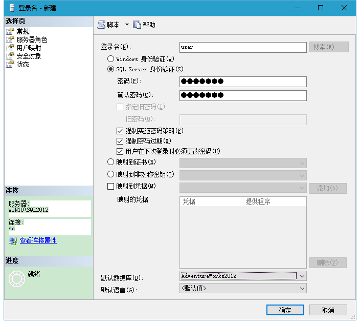 6.回到【登录名-新建】对话框,设置AdventureWorks2012数据库作为登录的默认数据库。当用户连接到服务器且不指定数据库时,这是用户使用的数据库。这不限制用户只访问那个数据库。插图2.4展示对于在WIN10的机器上Windows的登录用户woodytu,设置默认数据库为示例数据库AdventureWorks2012的登录配置。