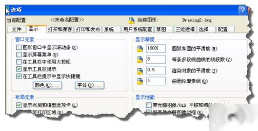 4、在“选项”窗口,显示选项卡中,将显示精度圆弧和圆的平滑度调整为1000。再re指令就要以解决问题。