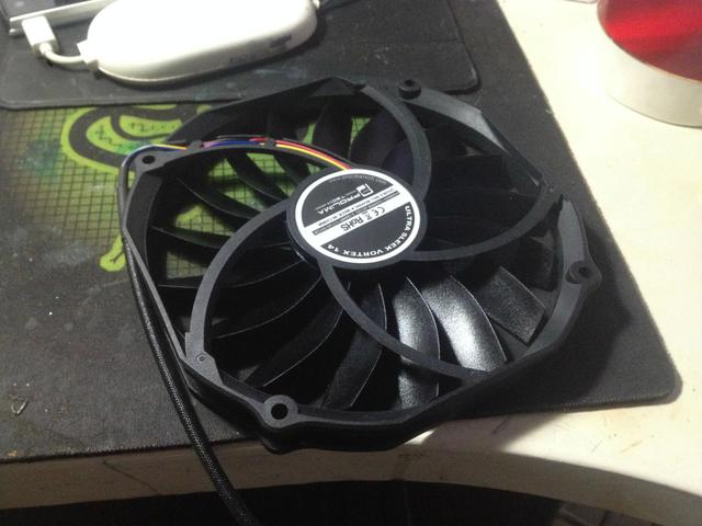 7、风扇采用的是一款15mm超薄14CM风扇,测试风量不错,而且静音,风扇出风口也采用了隐藏设计,吸取前一版风扇高转速时的气流噪音问题,这次通过加入挡风和引流设计有望消除。
