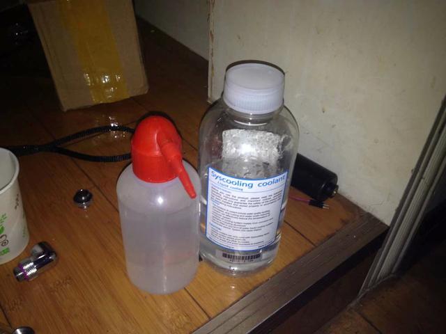 加液了~~,先前搞了过水测试,所以直接上冷却液了,专用冷却液和注水瓶准备